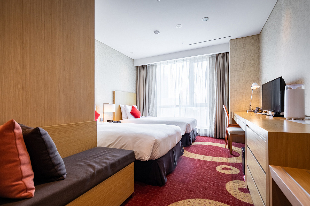 ビビッドな赤がアクセントになっている「スタンダードツイン」。全室ウォシュレット付きでシャワーブースとはセパレートされているので清潔です。クローゼットには消臭剤も置いてあり、随所に日系ホテルならではの細やかな気配りが感じられます。