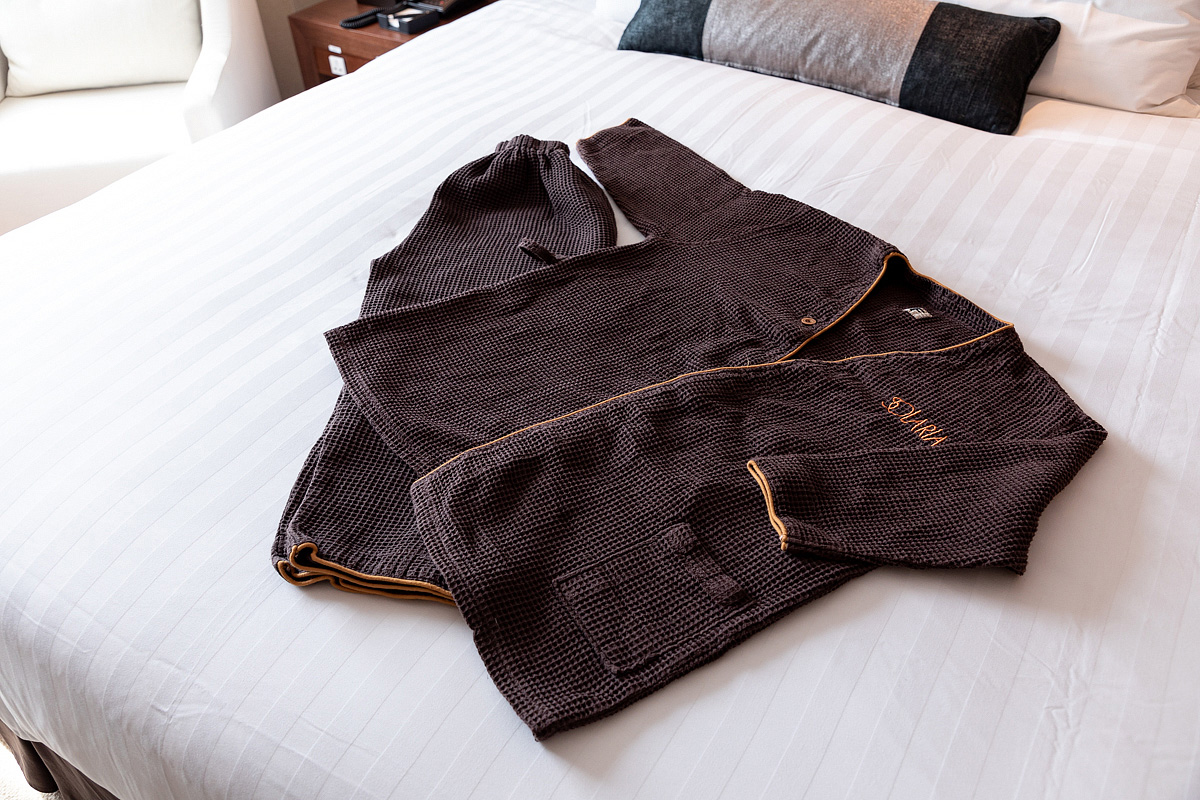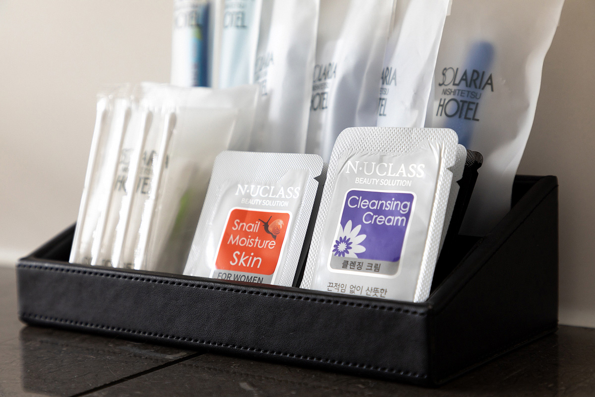 メイククレンジング、歯ブラシ、綿棒、ボディタオルまでなんでも揃っている客室のアメニティ。注目はスネイルモイスチャー化粧水。トロトロの化粧水でプリプリお肌になれそう。また肌触りの良いタオル地のようなセパレートタイプのルームウエアも用意されています。