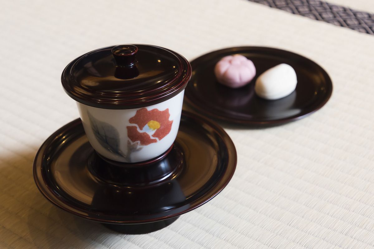 休憩室利用の場合は、無料でお茶とお茶菓子がいただけるんですよ。道後温泉の伝説にまつわる白鷺または椿をモチーフにしたお茶菓子を味わいながら、湯上りにリラックス。砥部焼の茶器がかわいい。