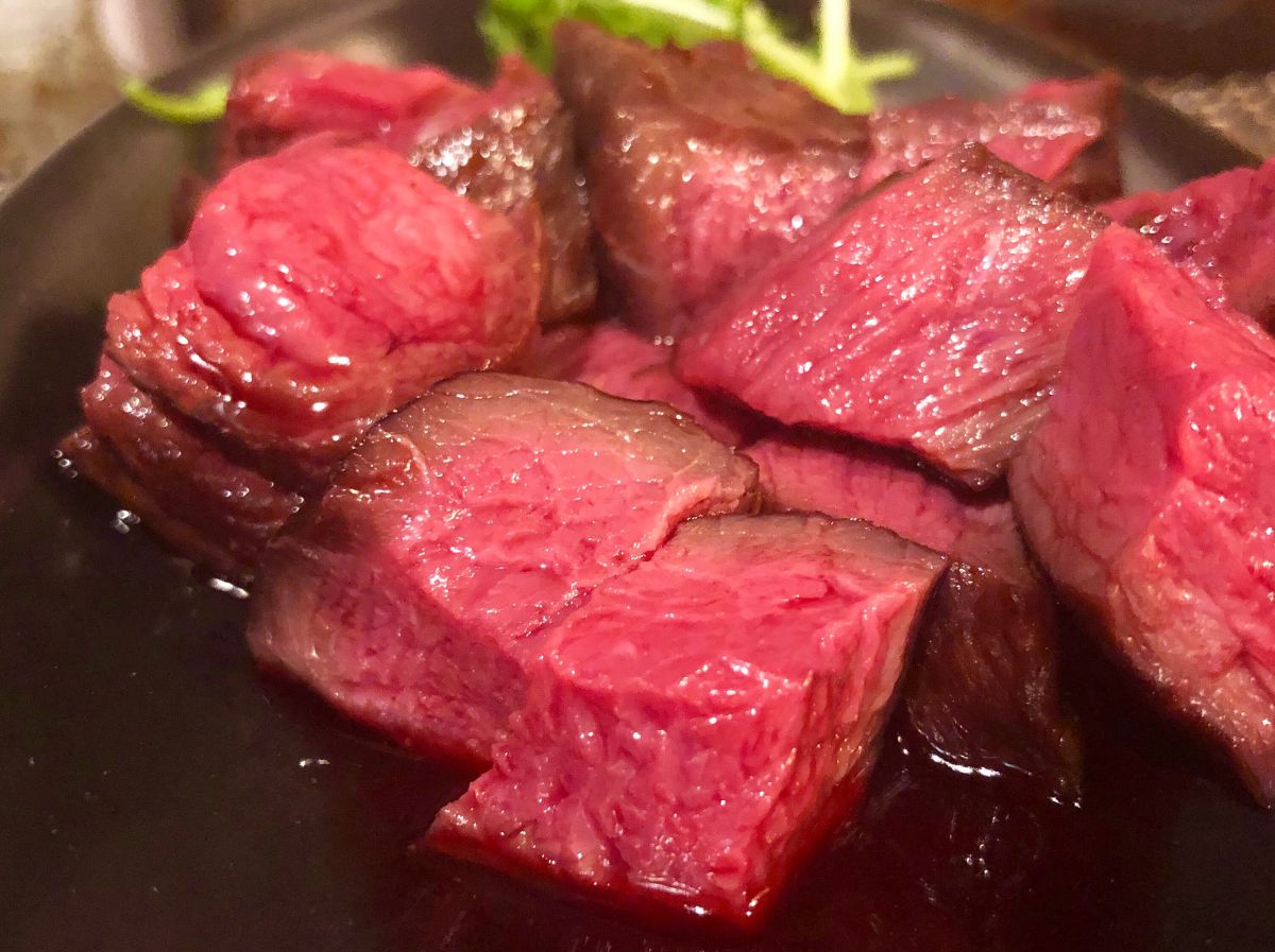 また、複数人で訪れたなら、「本日の塊焼き」(税込2800円)も注文したいところ。赤身肉の旨みがグッと閉じ込められたおいしさは格別!焼きあがったら、お店の方が一口サイズにカットしてくれます。