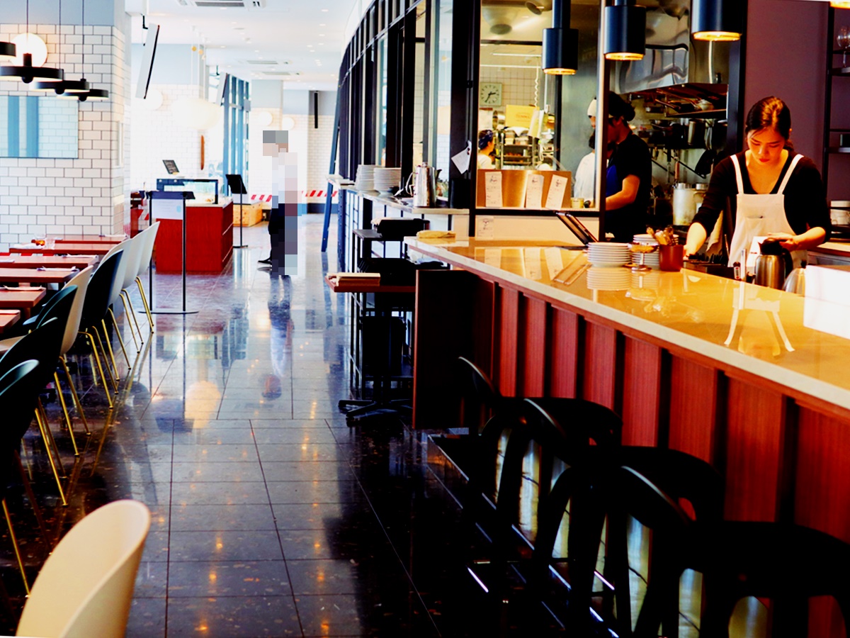 営業時間は朝の8時~24時。ブレックファストからランチタイム、ディナーからバータイムまで、さまざまな利用ができるオールラウンドレストランです。広々とした店内にはカウンター席とテーブル席があり、シンプルながらもモダンで落ち着いた雰囲気。