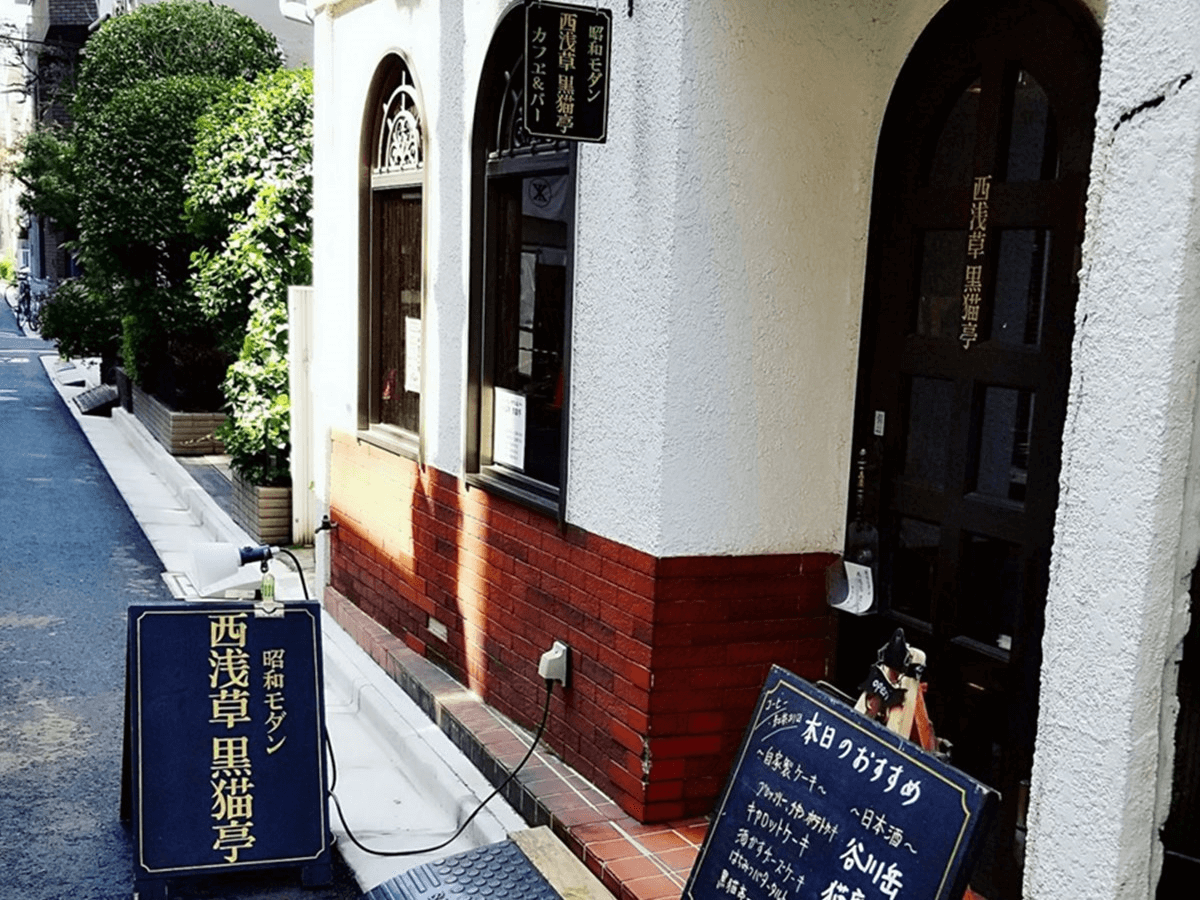 西浅草にある昭和モダンなカフェ&バー「黒猫亭」。店頭に置かれているボードの本日のおすすめには、自家製ケーキ数種類の他に谷川岳、猫魔の雫、天狗舞などの日本酒も一緒に書かれています。