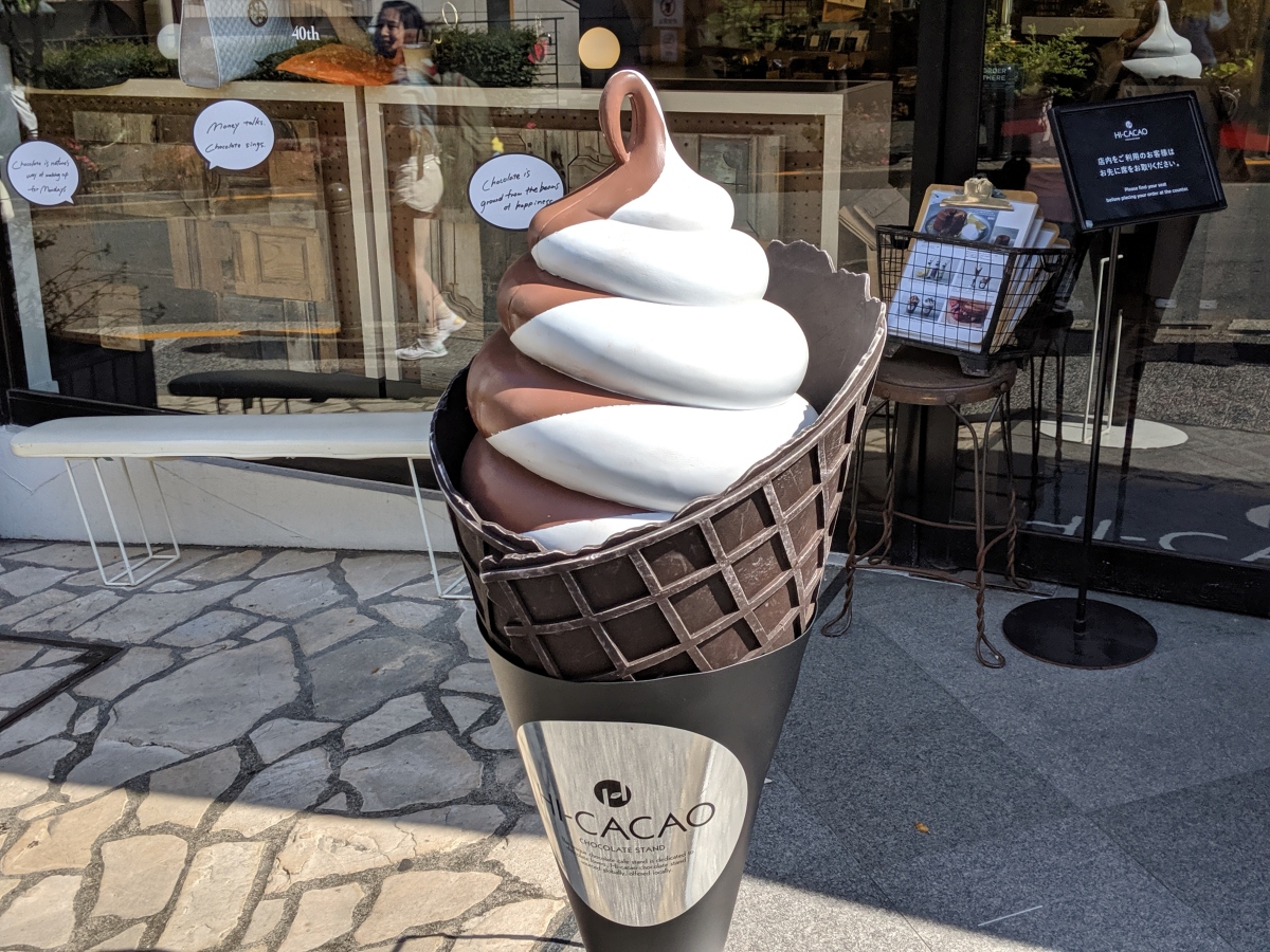 「HI-CACAO CHOCOLATE STAND」の目印となるのは、この大きなソフトクリーム。 お店のメニューにあるソフトクリーム、そのまんまです。