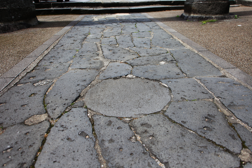 拝殿前の敷石に埋め込まれている「両性合体石」。この石を力強く踏んで参拝すると縁結びの願いが叶うのだとか。