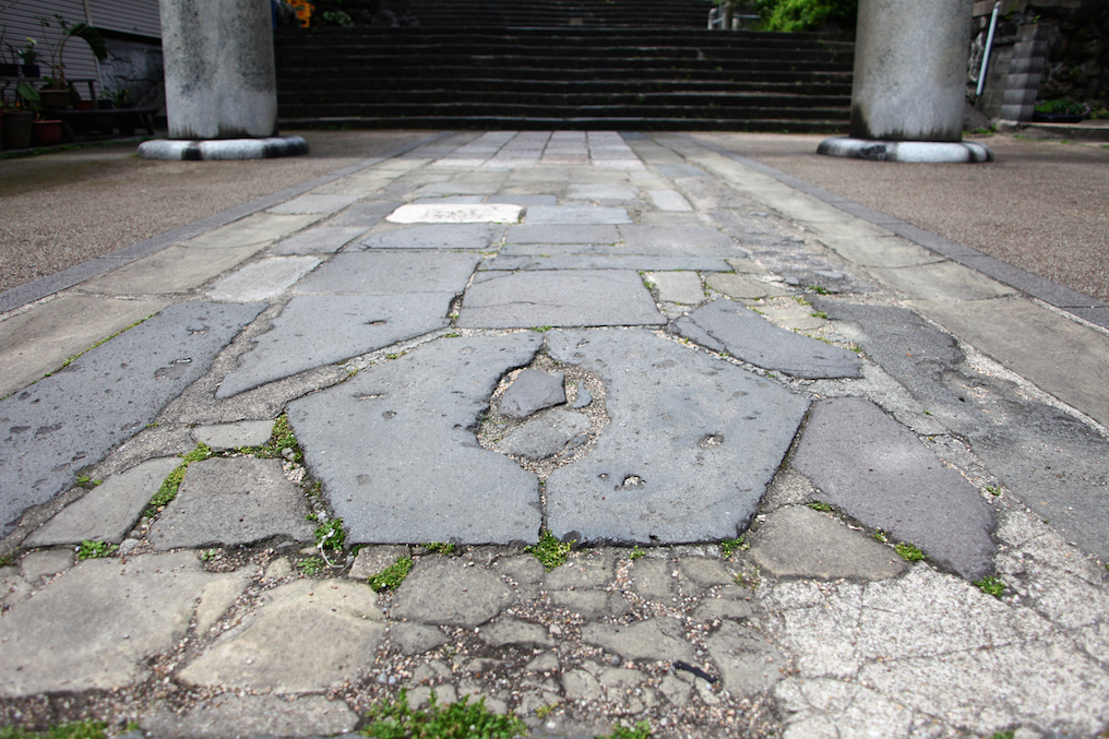 諏訪神社には江戸時代から伝わるというミステリアスな「陰陽石」が埋め込まれています。「男石」「女石」「両性合体石」の3つの石がこれにあたり、この一の鳥居の下の参道には丸い形の「男石」が埋め込まれています。女性の参拝者はこの「男石」を踏んでいくのをお忘れなく。