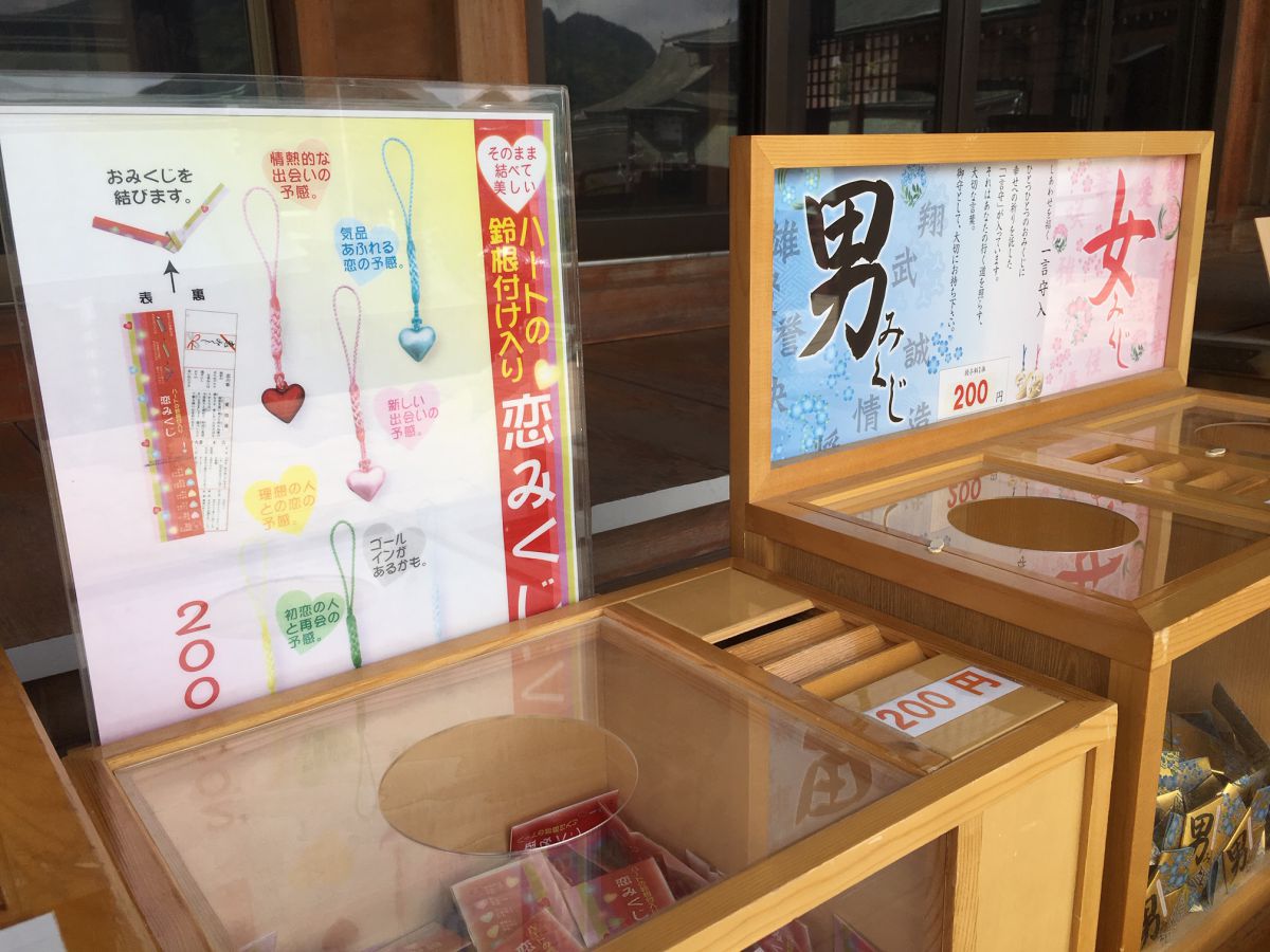 境内にあるおみくじも人気です。「陰陽石」同様、おみくじも恋みくじがあるほか、縁結びのお守りや絵馬もあります。