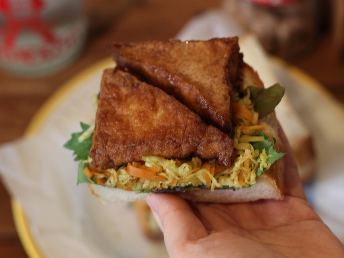 サクッサクの厚揚げとキャベツやニンジンのスパイシーマリネを、もちもちトーストでサンド。ポップな見た目とは裏腹に、複雑な味わいが絡み合うじつに大人っぽいテイストです。もちもち、しゃっきり、サクサクの食感のコントラストも楽しんで。
