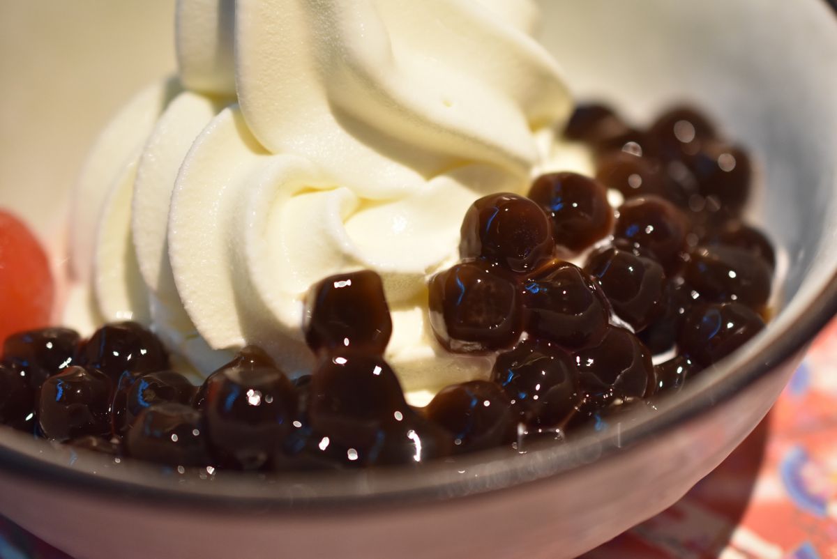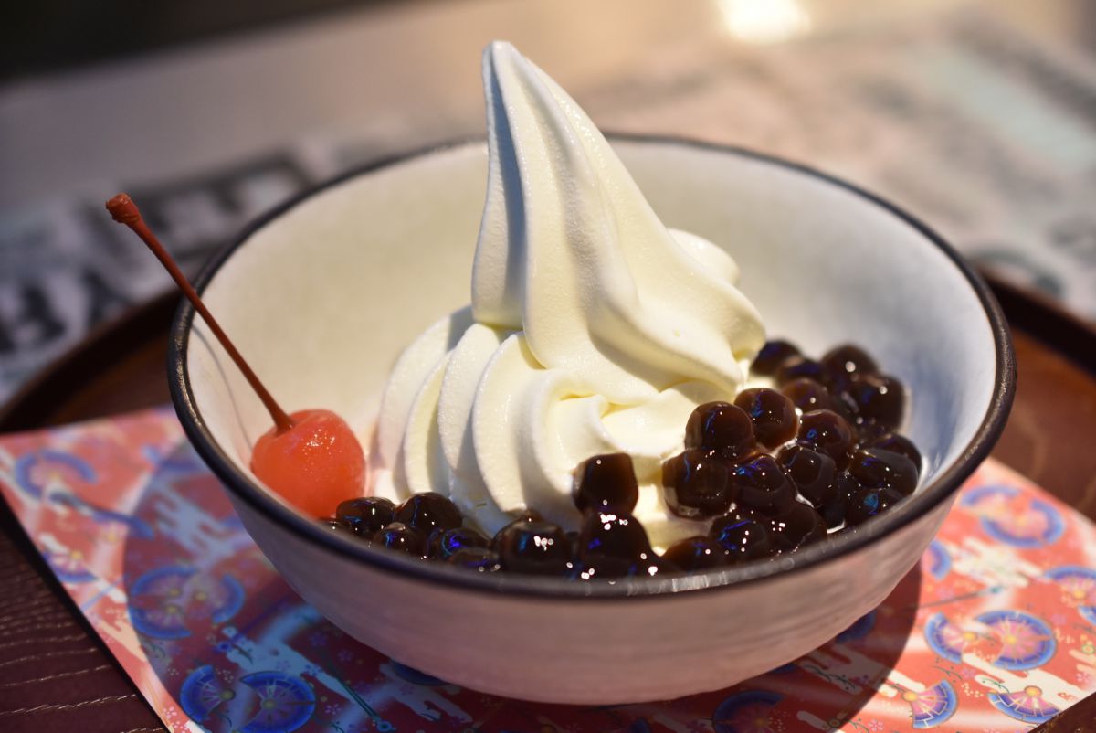 ひんやりなめらなかソフトクリームと、つるつるもっちりとしたタピオカの食感がたまりません。