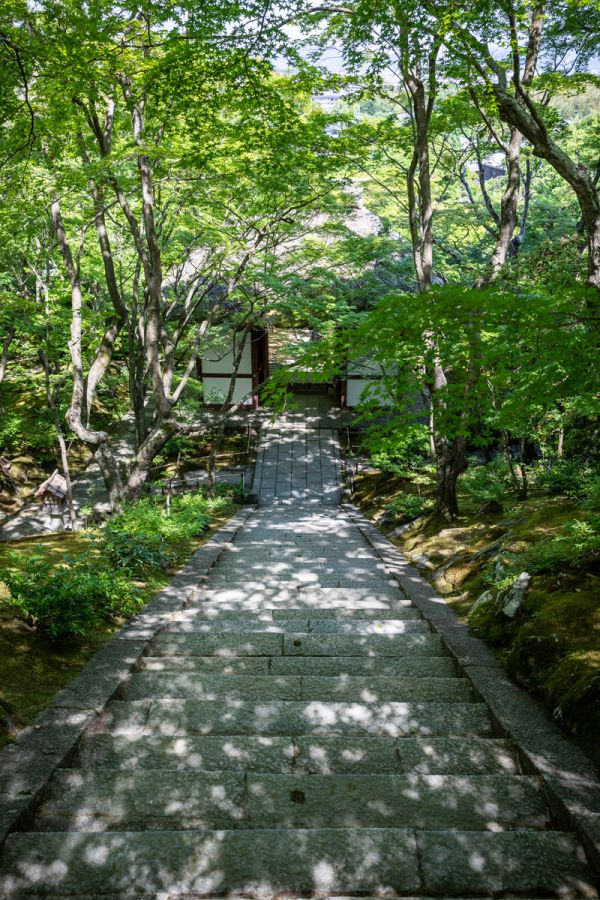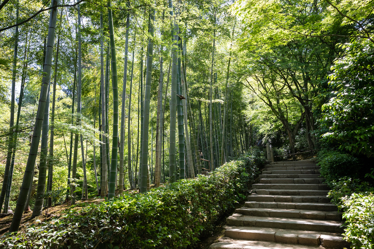 なかでも、この季節にぜひ訪れたいのは、青竹や青もみじに囲まれた境内。ふかふかの苔が一面に広がる世界は、毎朝水を与えることでみずみずしさを保っており、その美しさはJR東海のCMにも使われたほど。秋には真っ赤な紅葉がじゅうたんのように広がる散り紅葉も有名です。