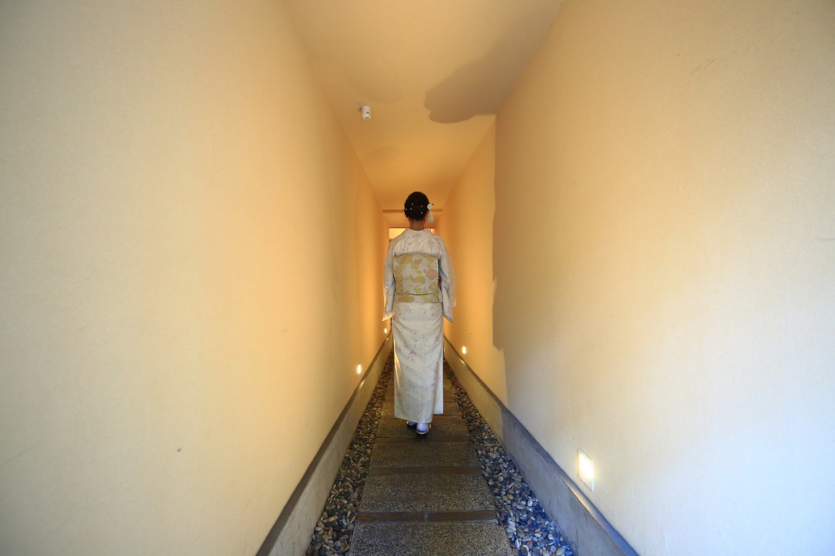 阪急四条河原町の駅から徒歩約5分。土地が細長い町家特有の“鰻の寝床”を利用した白壁の路地が特徴的です。センスが感じられる独特の空間に期待が高まります。