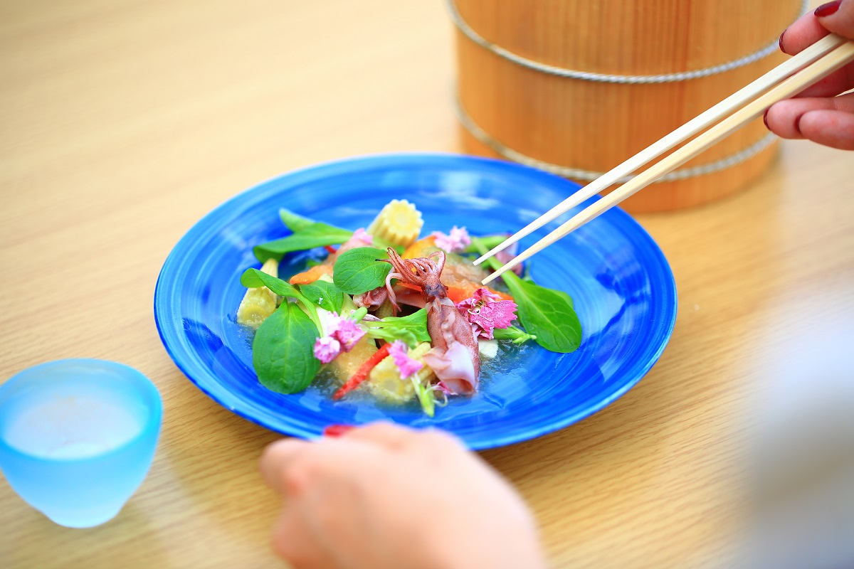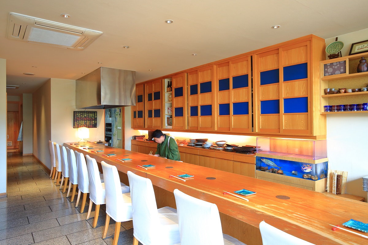 路地を抜けると7メートルもある檜の一枚板のカウンターがお目見え。板前さんをはじめとするスタッフは皆和装で、建具やイス、テーブルなどは和洋を違和感なく融合。ハイブリットながら落ち着きのある空間です。音楽にはジャズをチョイス。夜にはラグジュアリーな雰囲気も漂います。