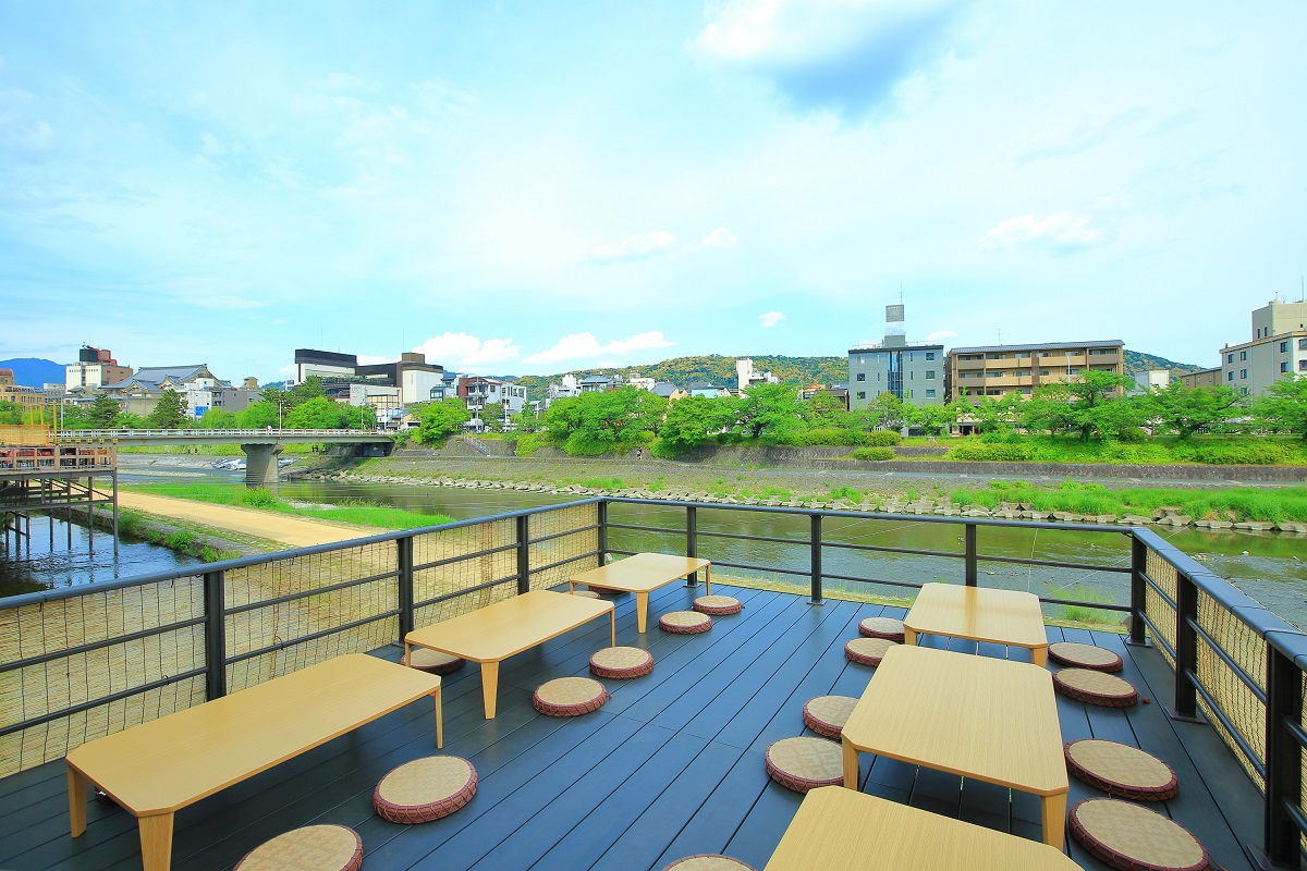 夏の川床は、ブラックの板を配したテラスで。四条大橋、東山を見渡せ、河川敷の緑も爽快。鴨川の川床には珍しく、左右隣に床席がないので、開放感もひとしおです。