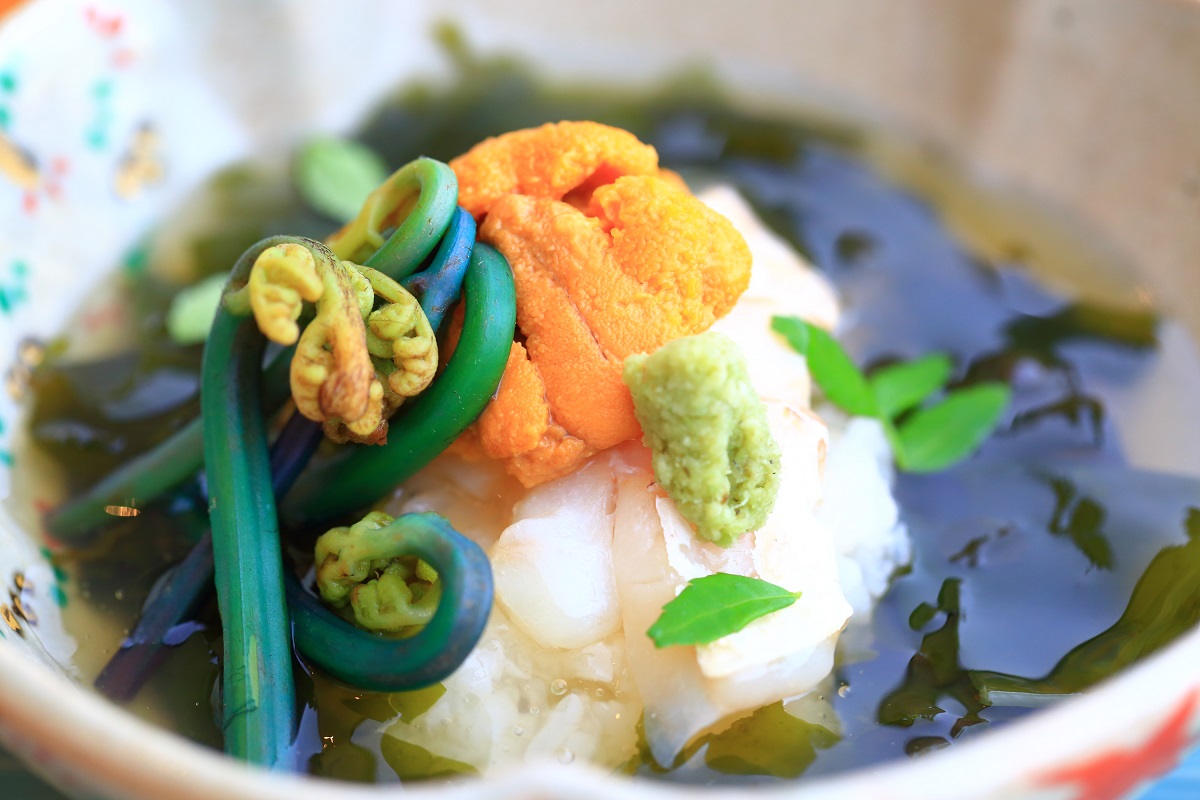 蒸物椀は、飯蒸しの上に真鯛とウニをのせたもの。ワカメが入った上品なあんが素材の味を引き立てます。