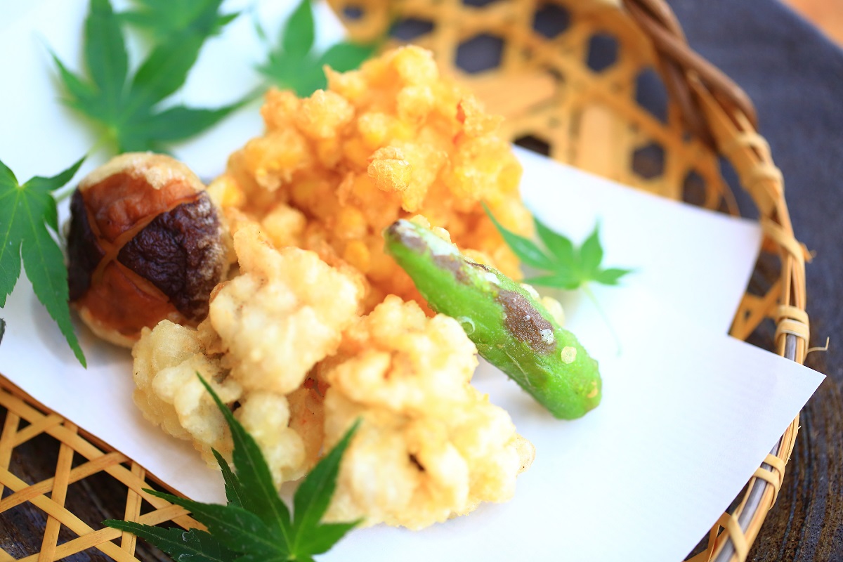 揚物は鱧ととうもろこしの天ぷら。吟味して選ぶ鱧はもちろん美味ですが、オリジナリティ溢れるとうもろこしのかき揚げも板前さんイチオシの自慢の一品なんです!
