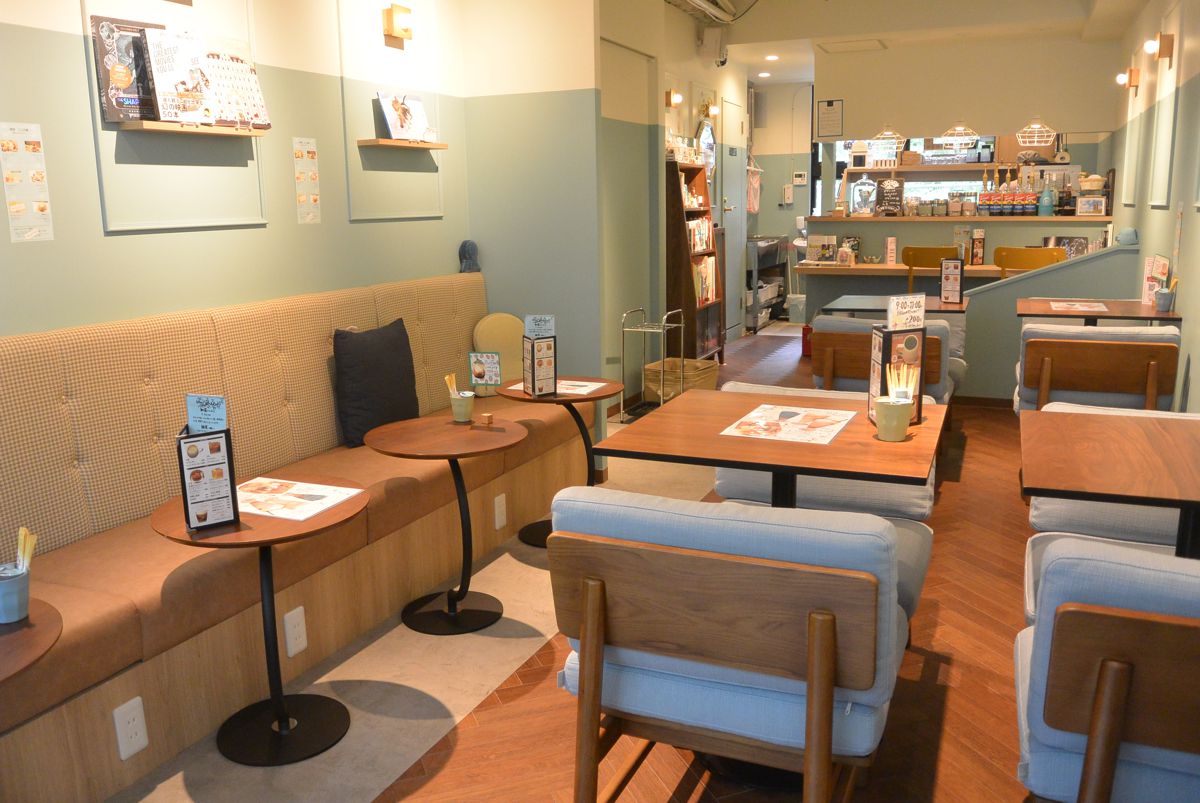 階段を上がって店内へ。すると、入り口からは想像もできないような空間が!壁一面がミントブルーで、まるでジブリの世界に迷い込んだかのようなほっこりする空間です。