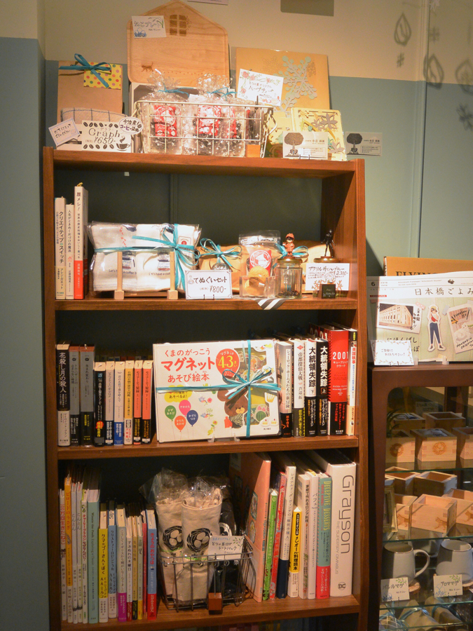 お店の隅には厳選したこだわりの本が並びます。じっくり本棚を見ていると、絵本よりも小説やアート系の本が多いのがわかります。プレゼント用にかわいいリボンのラッピングもしてくれますよ。