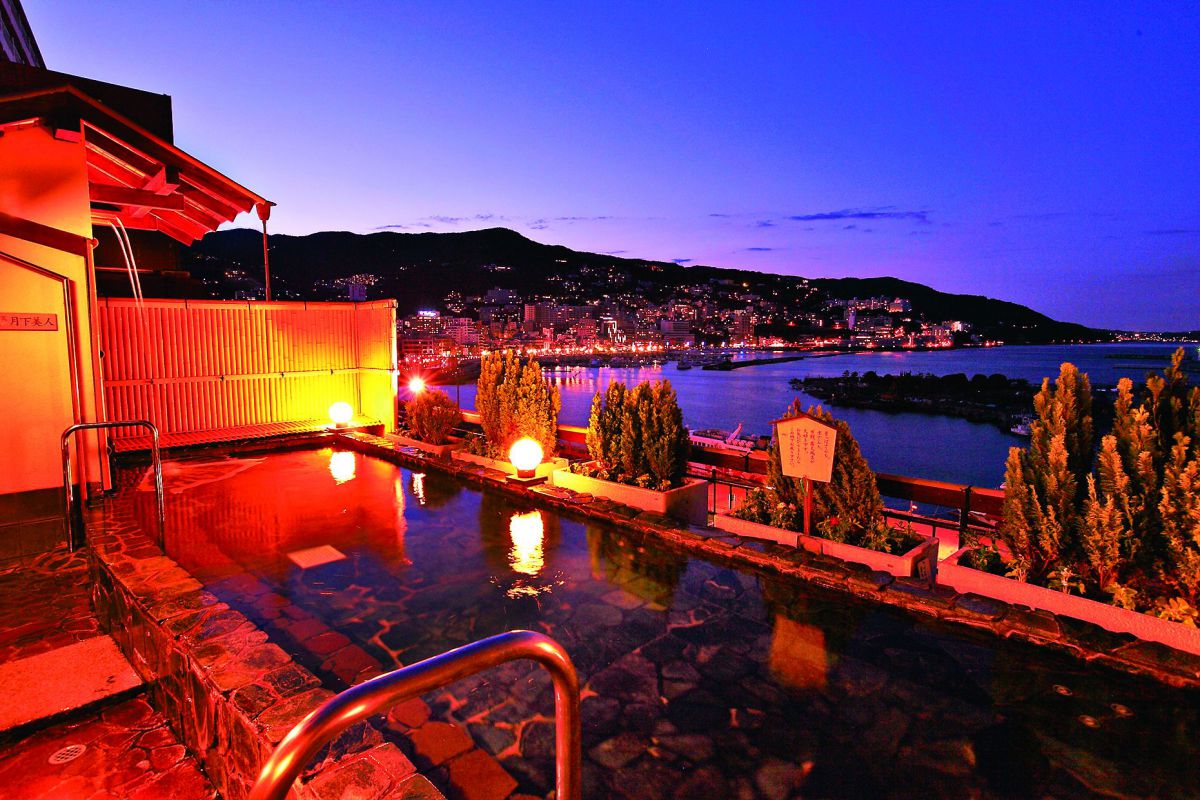 全客室から海と夜景を望める眺望が自慢の「秀花園 湯の花膳」。屋上には「月の湯処(写真)」「花の湯処」と名付けられた男女入替制の浴場があり、いずれも日帰り入浴OK。目の間に熱海湾が広がる「月の湯処」にはカメ風呂が、心地よい潮風を感じられる「花の湯処」にはつぼ風呂があり、湯めぐり気分でのんびりと楽しめます。