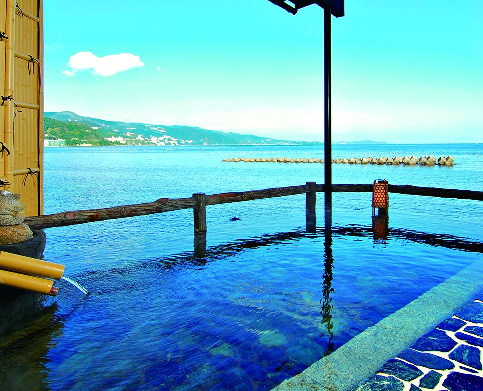 眼前の網代湾まで一切遮るものがない最高のロケーションなので、海に面した大露天風呂に入れば海に浮かんでいる気分が味わえます。日帰りOKの大露天風呂は2つあり、男女入れ替え制(写真は昼男湯)。地下300mから湧きだす源泉の透明度と成分の濃さが魅力です。海の幸をふんだんに使った料理では、アワビや伊勢エビなど相模湾の恵みを余すことなく味わえます。