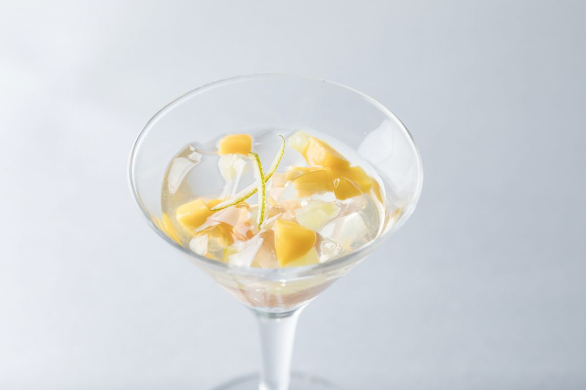 旬のフルーツをふんだんに使ったデザート4品のフルコース「デザートコースプラン」4500円も、6月1日(土)から夏メニューに。1皿目のアミューズは、涼しげな「パリパリキュウリとライムのゼリー マンゴーの香り」。