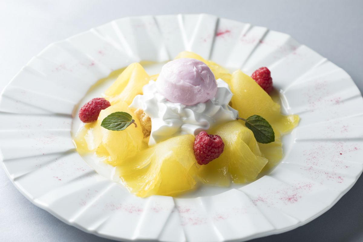 2皿目のアヴァンデセールは、太陽をイメージした「パイナップルのエマンセとピーチシャーベット ココナッツのエスプーマ添え」。