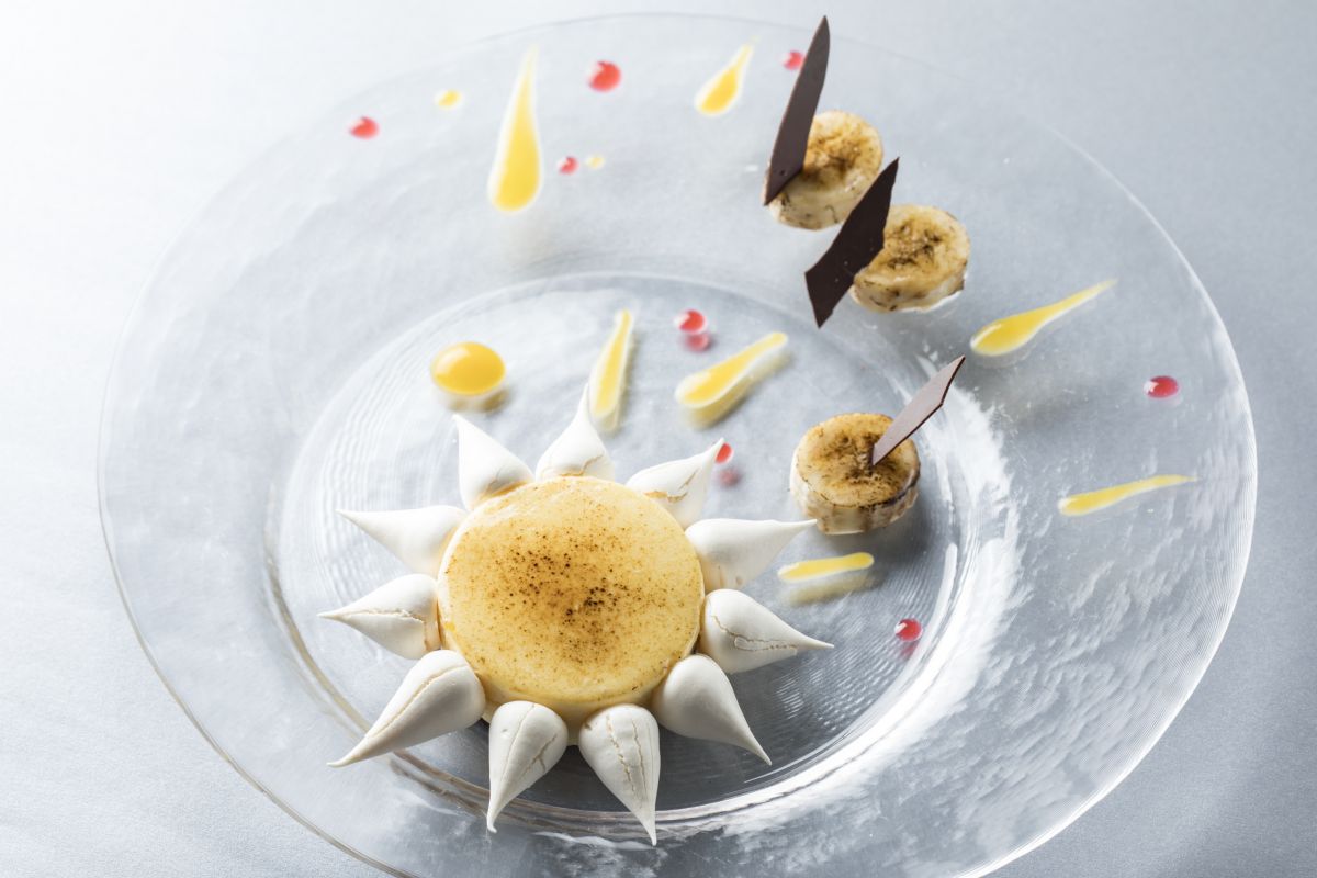 3皿目のグランデセール「パッションフルーツのシブースト “ア・ラ・フルール”」は、ひまわりをイメージした夏にピッタリな一皿。