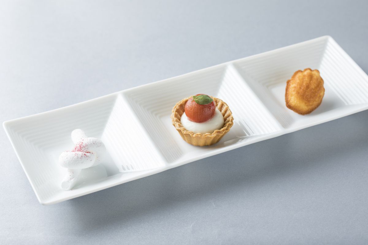最後のプティ・フールは、「木苺のギモーヴ」、「ミニトマトとチーズのタルトレット」、「青森県蓬田村産福々たまごのマドレーヌ」がかわいらしく並びます。