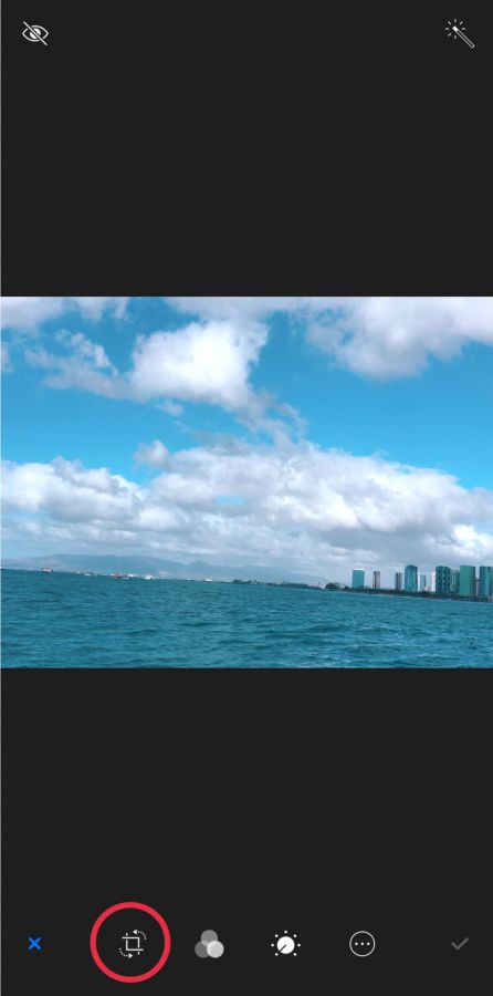 まず、カメラロールで写真を選択し編集をタップ。さらに◯部分をタップします。