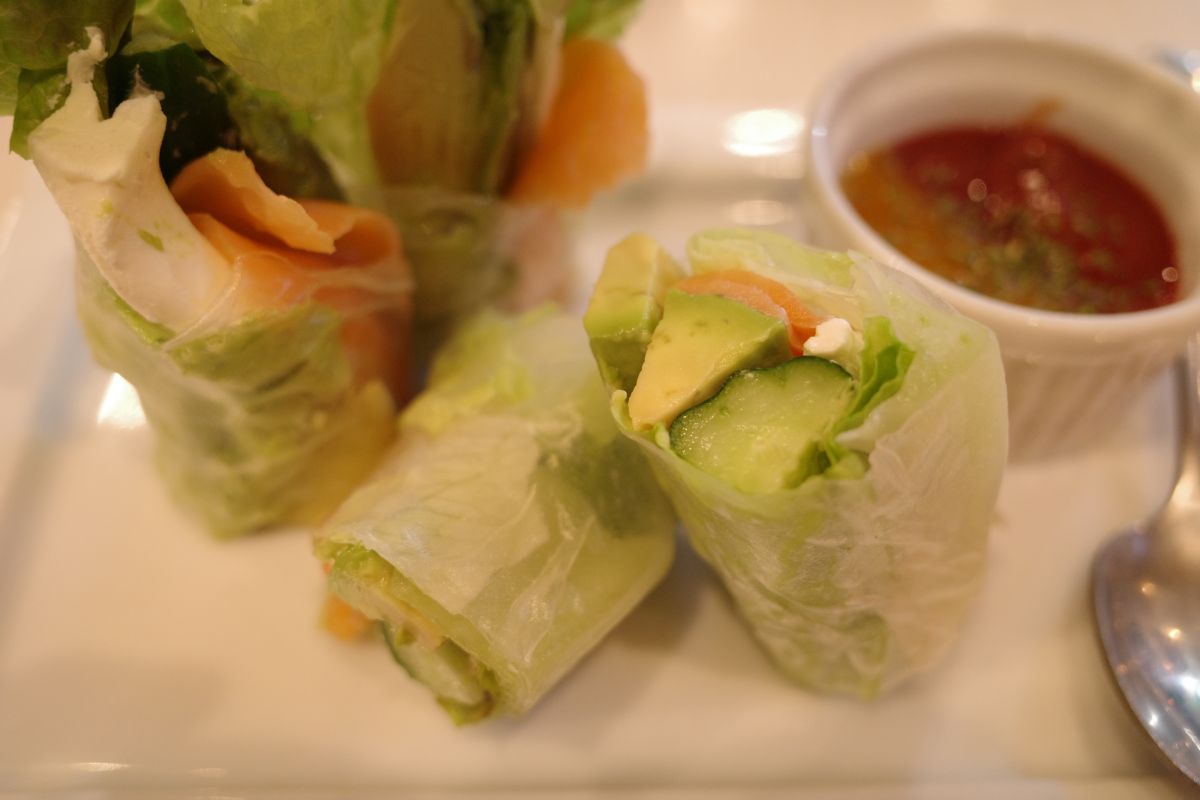 お料理はハンバーガーだけではありません。さまざまなハワイアン料理がそろっているので、ワインと合わせてぜひ楽しんでみてください。「スモークサーモンとアボカドクリームチーズの生春巻き」(税抜500円)は、大きなアボカドが入っていて、食べ応えもありますね!