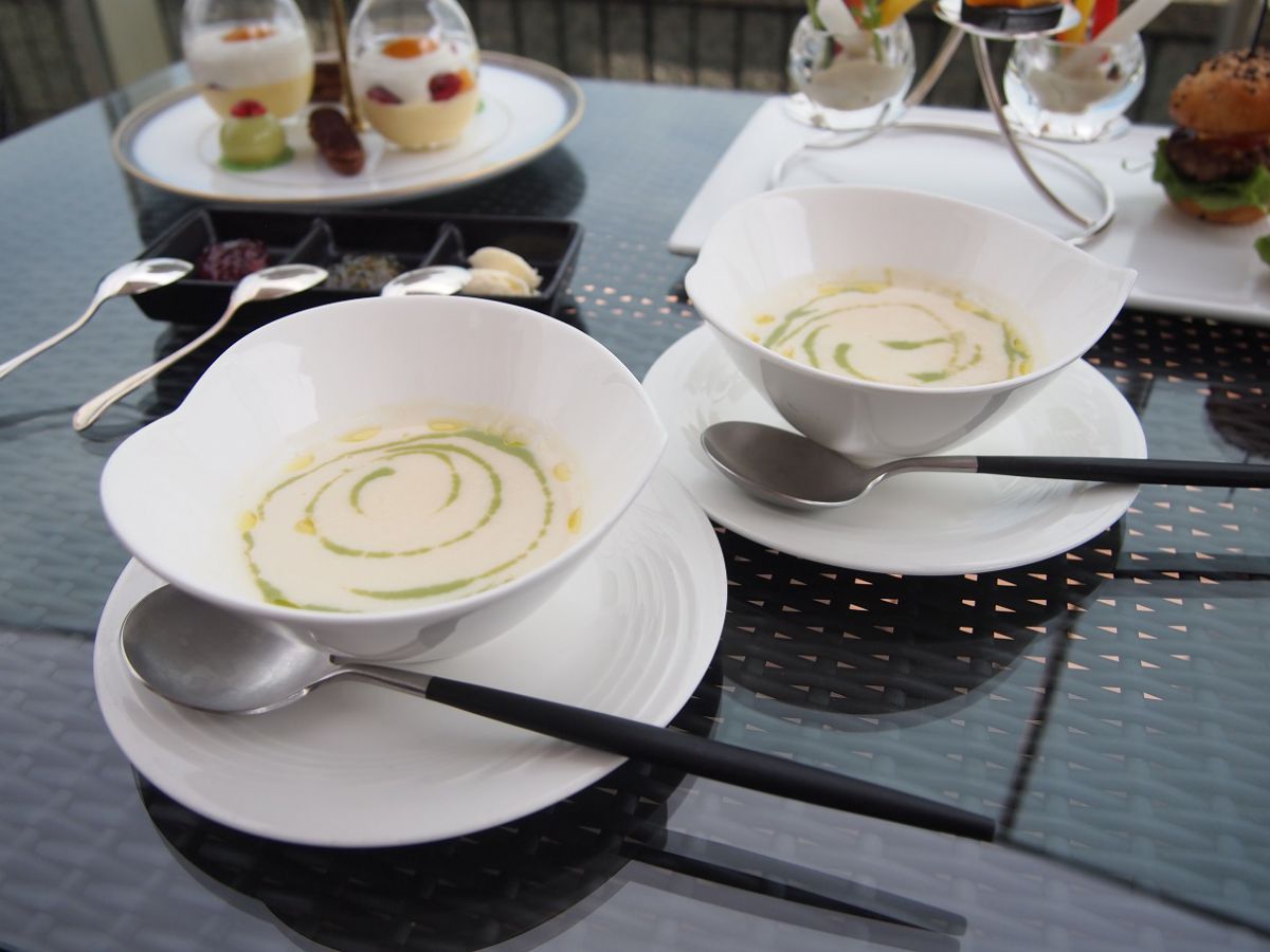 お食事のなかには、季節のスープも。新玉ねぎのスープをベースに、グリンピースのソースが掛けられており、まろやかな口当たりに仕上げられています。
