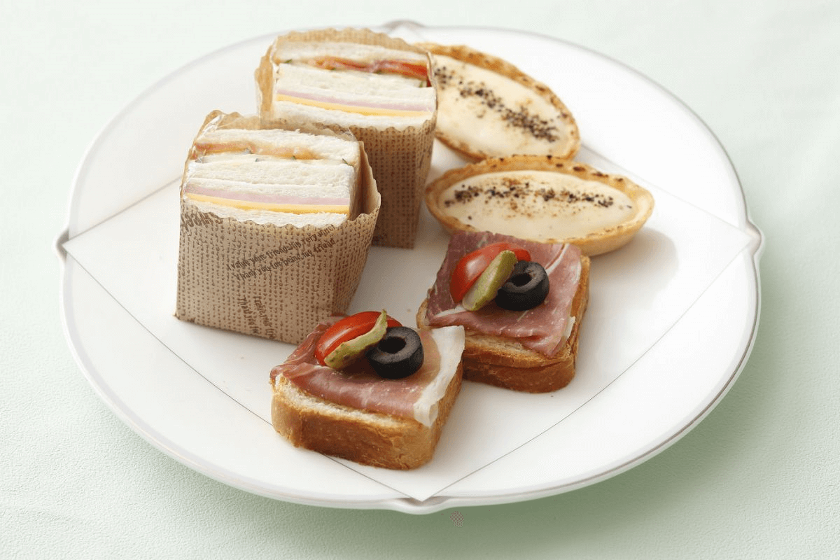 セイボリーは、オープンサンド、チーズのキッシュ、サンドウィッチのスタンダート3種。ドリンクはほうじ茶ラテなど、抹茶にぴったりの15種類からチョイスできますよ。