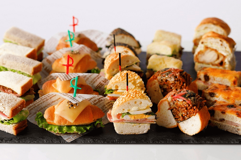 サンドイッチは15種類ものバラエティ豊かなラインナップ。「ローストビーフ&レタスサンド」「クラシックポークカツサンド」「だし巻玉子サンド」「ソース焼きそばサンド」など個性的な面々!ひと口サイズなので、沢山の種類を楽しめます。