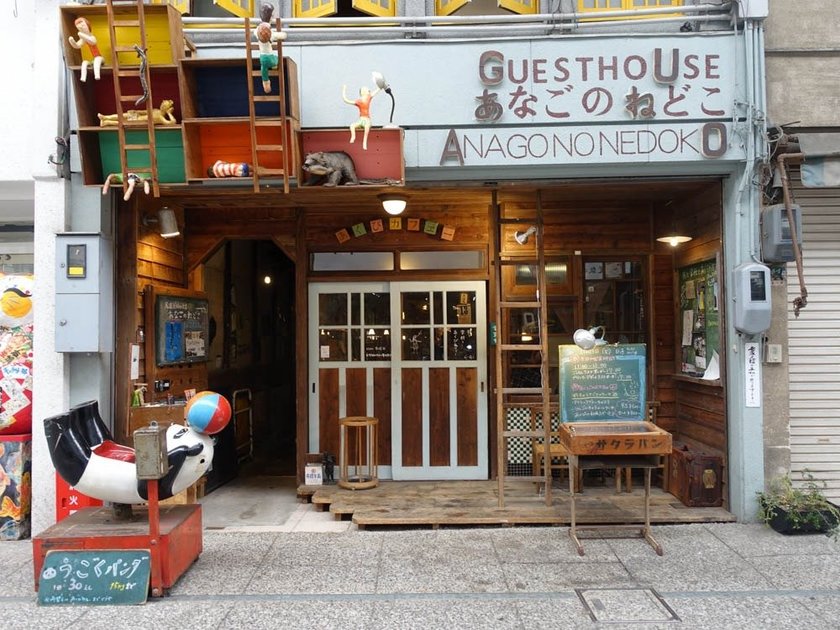尾道商店街を突き進むと見えてくるレトロな外観の建物。「あくびカフェー」は、ゲストハウス「あなごのねどこ」と同じ建物にあります。見落とさないように注意!