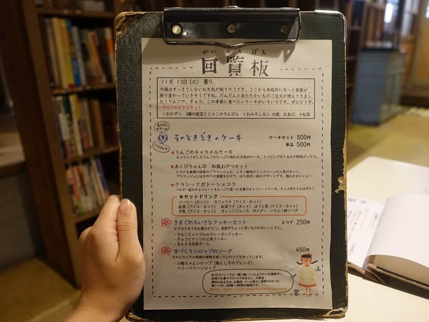 日ごとのメニューは回覧板のバインダーに挟んであります。店内には、いたるところに懐かしのアイテムが散りばめられていて、学生の頃の思い出が蘇ってきそうです。