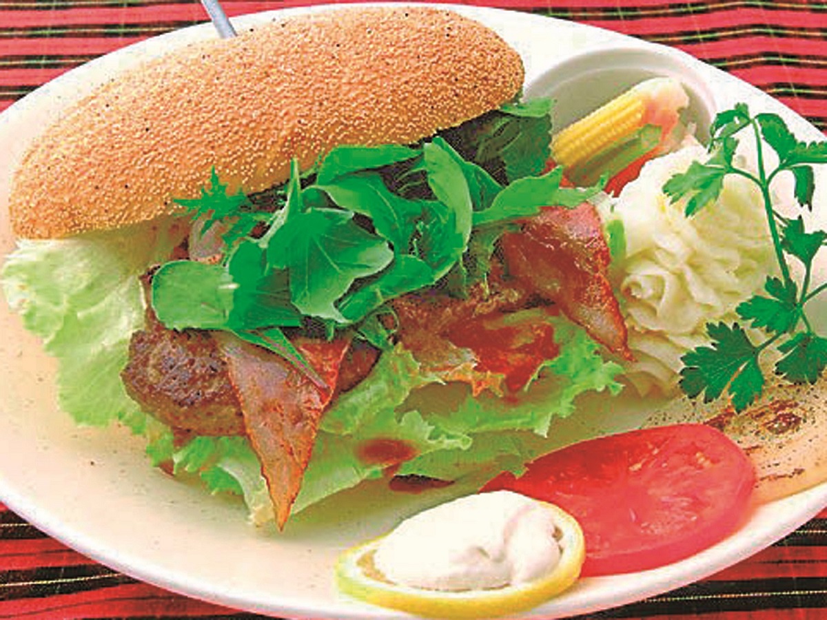 くつろげるマイナスイオンたっぷりのガーデンテラスは、特に人気の席。ここでいただきたいのが、写真の「ペニーレインバーガー」(1500円)。ベーカリーで焼き上げた特製バンズを使用しています。