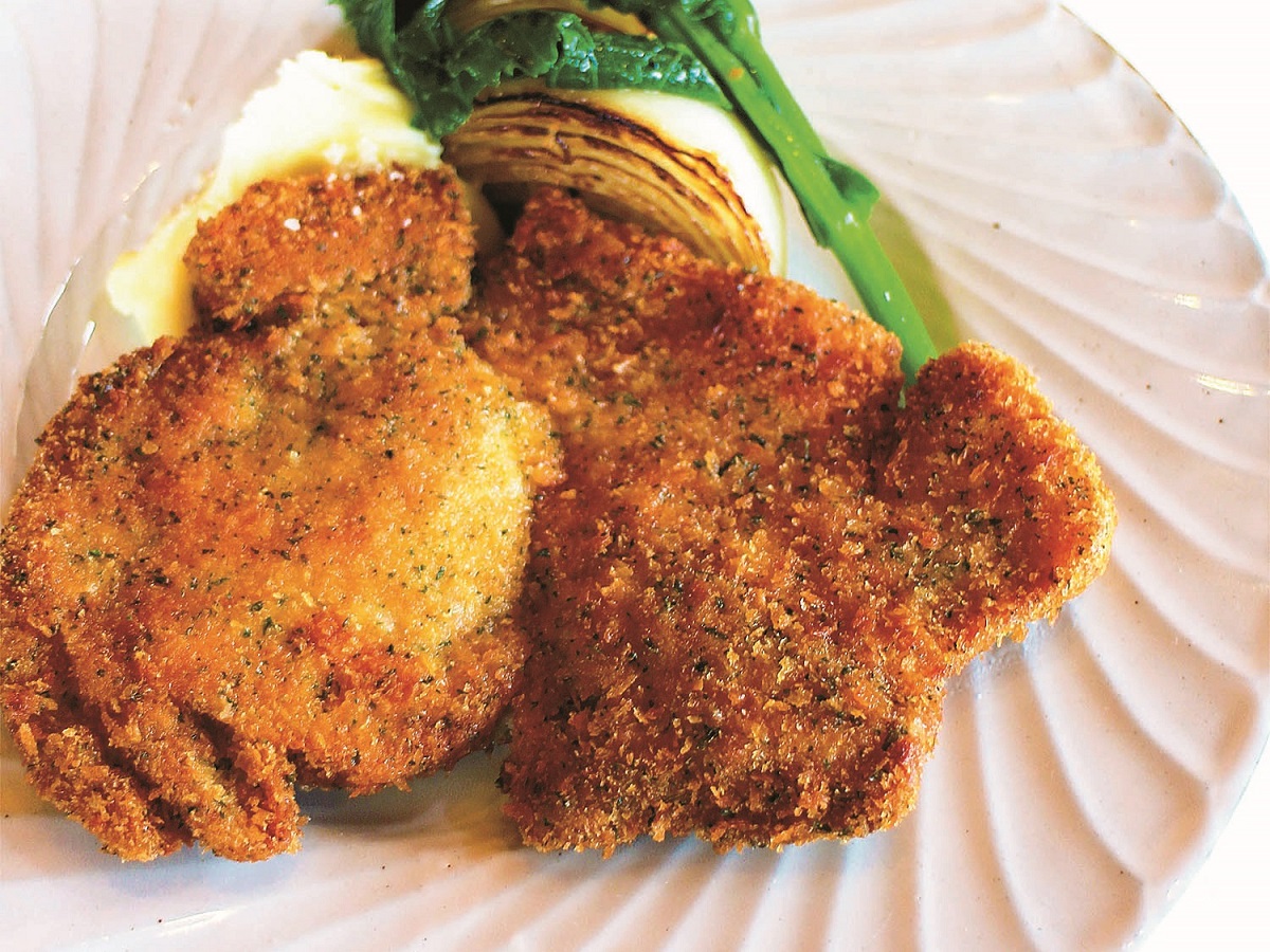 写真の「ポークカツレツ」は1980円。柔らかいもち豚のロースを使った一番人気のメニュー。ライスまたはパン、サラダ付きです。