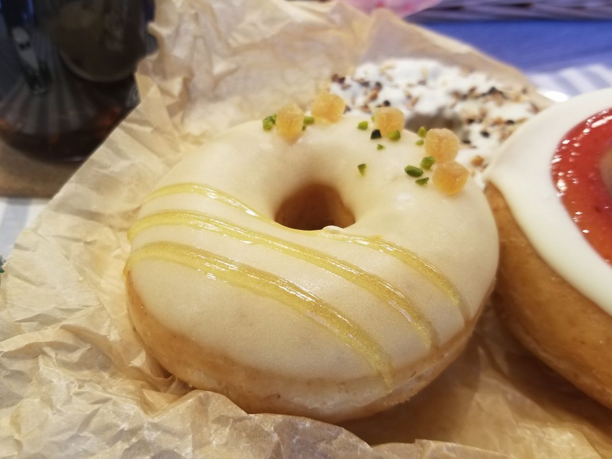 「ジンジャー レモン ブラン」(230円/税別)でも、柔らかなイースト生地にブランが練りこまれています。こちらのドーナツは、ジンジャーとレモンをミックスした、爽やかに香るアイシングでコーティング。レモンソースで描かれたラインが夏らしさを感じさせ、その上にのったピスタチオとハニーキューブもカラフルで可愛らしいですね。