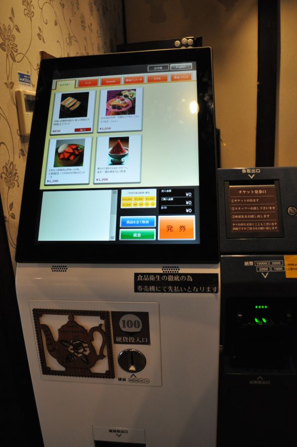 注文、お支払いは発券機を利用します。食品を扱うスタッフがお金を直接触らないようにする衛生的配慮がされています。