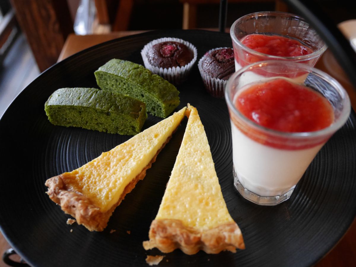 上段のプレートには、4品。上から時計まわりに、ラズベリーの酸味が効いたブラウニー。苺のコンフィチュールと京丹後の低温殺菌牛乳をつかったブラマンジェ。クラフティタルト。抹茶のパウンドケーキ。(季節によってメニューは多少変わります。)