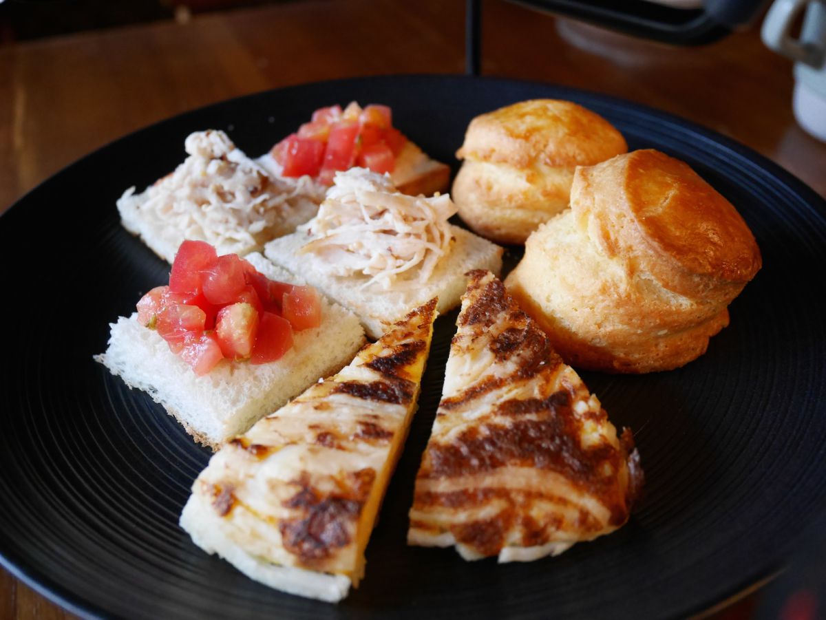 下段のプレートは軽食系で統一。右から時計回りに焼き加減が秀逸なスコーン、卵のコクが美味しいジャガイモのガレット、ハーブの効いたチキンとトマトサラダのオープンサンドが盛られています。