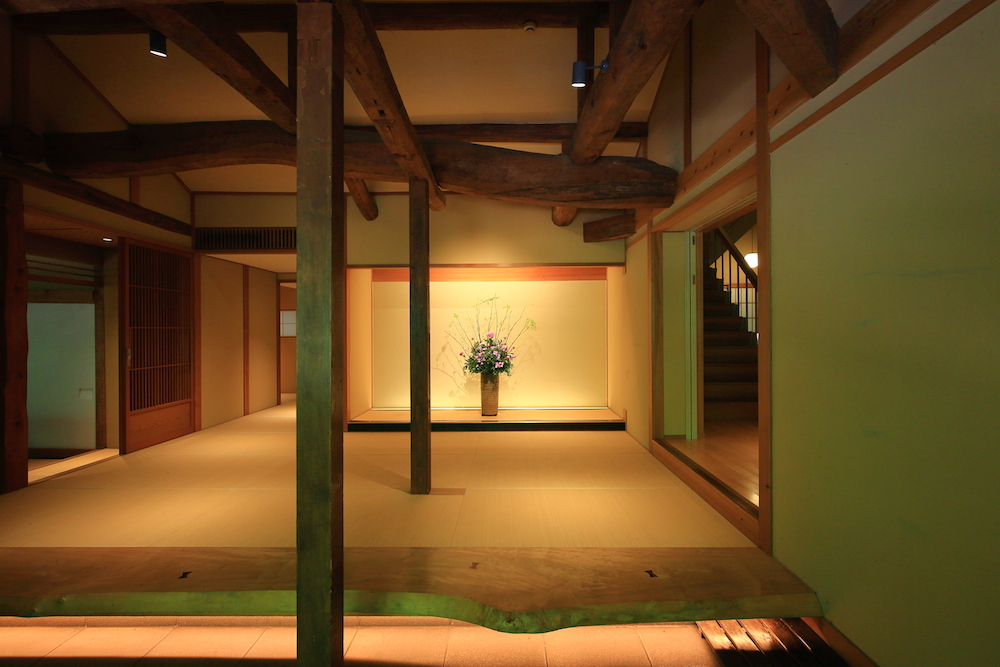 旅館館内は往時の梁や柱を残しつつ、モダンさも感じられる空間。広々としたエントランスから歴史ある宿の威厳を感じます。食事は川床以外にもテーブル席の大広間や、ウッドデッキのテラス席などで。多彩なシーンで本格懐石料理が堪能できるようになっています。(5~9月の川床シーズンについての館内席利用は悪天候時のみ)
