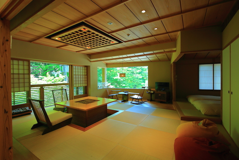 宿泊できる客室はメゾネットタイプの2室のみで、いずれもスイートルームのような造り。貴船の自然を望む大きな窓が開放的で、和室タイプには囲炉裏、洋室タイプには暖炉も!吹き抜けの書斎などもあり、ラグジュアリー感のある設えも素敵です。お風呂は2階にあり、なんと檜の露天風呂!