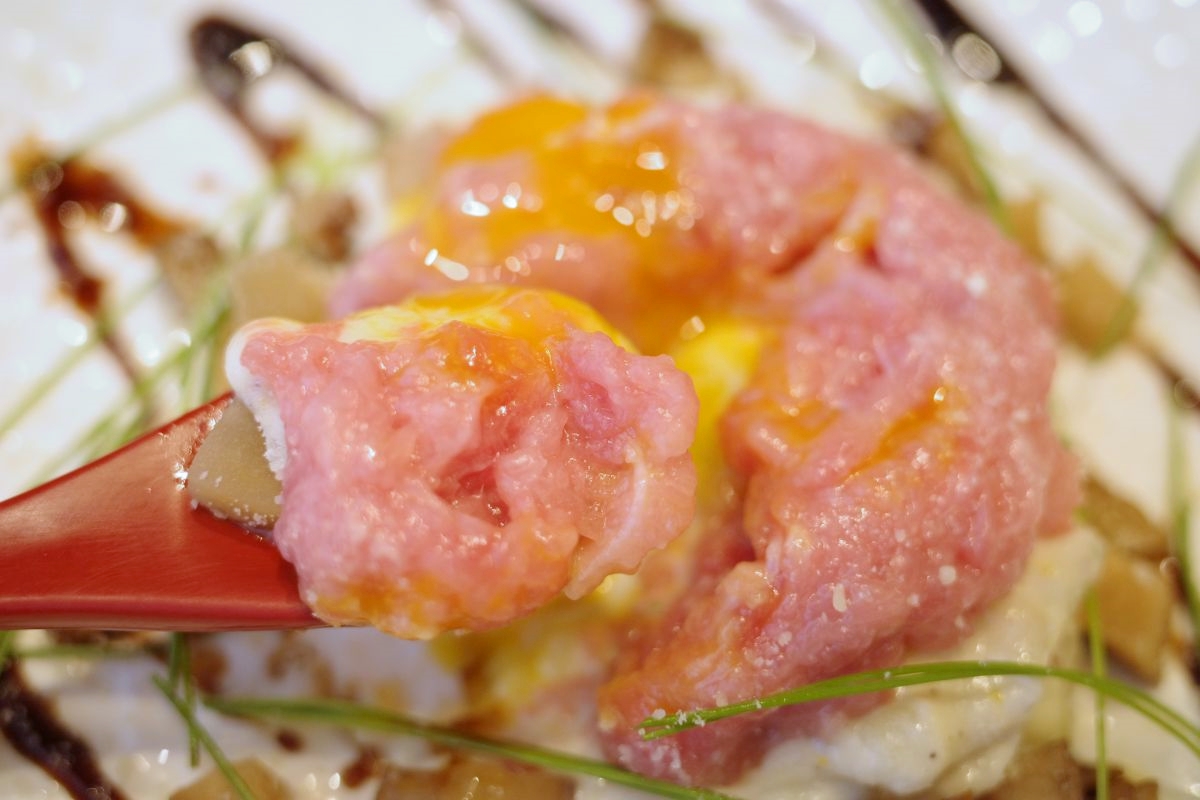 こちらは「まぐろのレバ刺し風」(税抜580円)。鮪の目の裏に付いている引き締まった赤身肉をレバ刺し風で楽しみます。ほどよい塩加減とゴマ油の風味がたまりません!