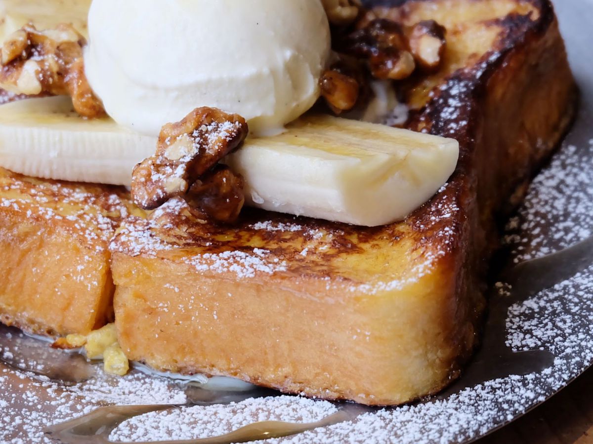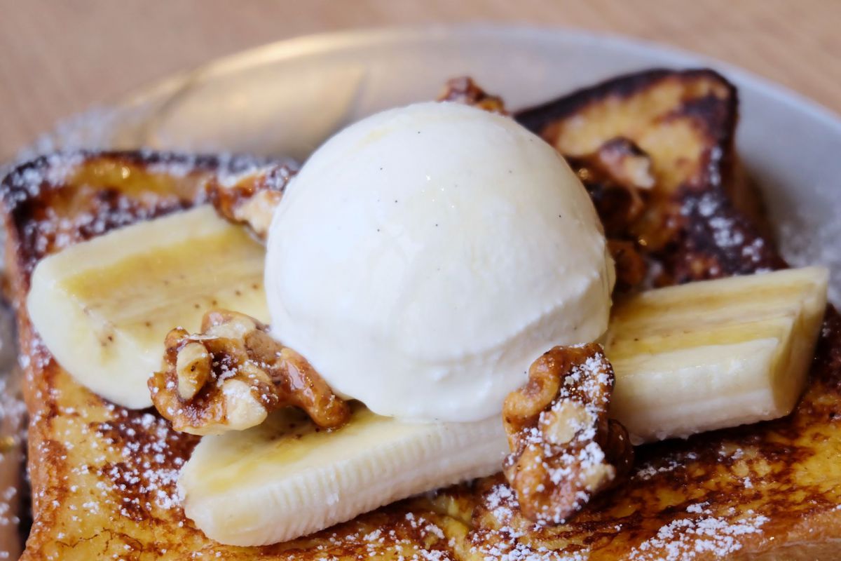 メープルシロップのかかったできたてあつあつのフレンチトーストには、バナナとくるみのキャラメリゼ、そして大きなアイスクリームが乗っています。