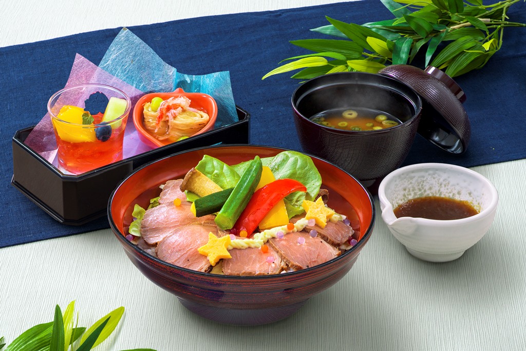 イベントごとに期間限定のメニューが登場する東京ディズニーリゾート。ディズニー七夕デイズも一部の店舗で限定メニューが登場します。それがこちらの「七夕膳」2800円。ワールドバザールの「れすとらん北齋」で提供されるメニューです。今年の七夕膳はローストビーフ丼に焼き湯葉の茄子の餡かけ、アセロラゼリーのところてん風、お味噌汁がセットに。