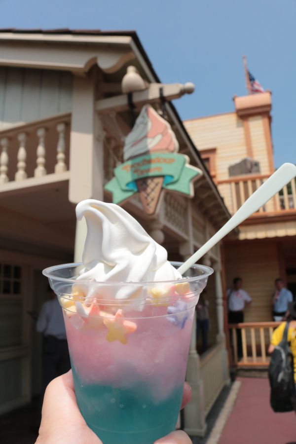 数種類発売されているスイーツの中で、おすすめがこちらの「クリーム・シェイブアイス」550円。ピーチ味のシェイブアイス(かき氷)にミルク味のソフトクリームをオン。下には爽やかな味わいのブルーゼリーが入っていて1つでいろいろなひんやりスイーツが味わえます。ファンタジーランドの「トルバドールタバン」でゲットできますよ。