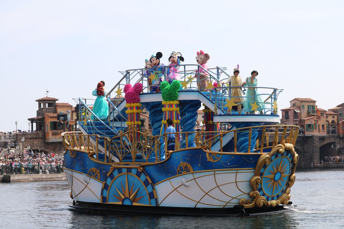 ミッキー、ミニーのほか、ダッフィー&シェリーメイ、アリエル&エリック、ジャスミン&アラジンが乗船して、メディテレーニアンハーバーを回ります。こちらは1日3回公演。願いをかけるミッキーたちのキュートな姿は必見。
