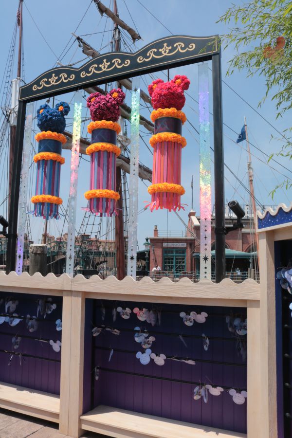 東京ディズニーシーでも同じ期間「ディズニー七夕デイズ」を開催中。東京ディズニーシーでの「七夕グリーティング」は一艘のパージ(船)に東京ディズニーシーならではのキャラクターたちが乗船。