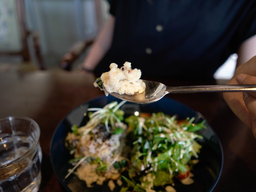 リゾットのお米には赤米が使われています。具材はほうれん草ときのこ。美容と健康に良い食材が使われた、女性にも優しいランチです。