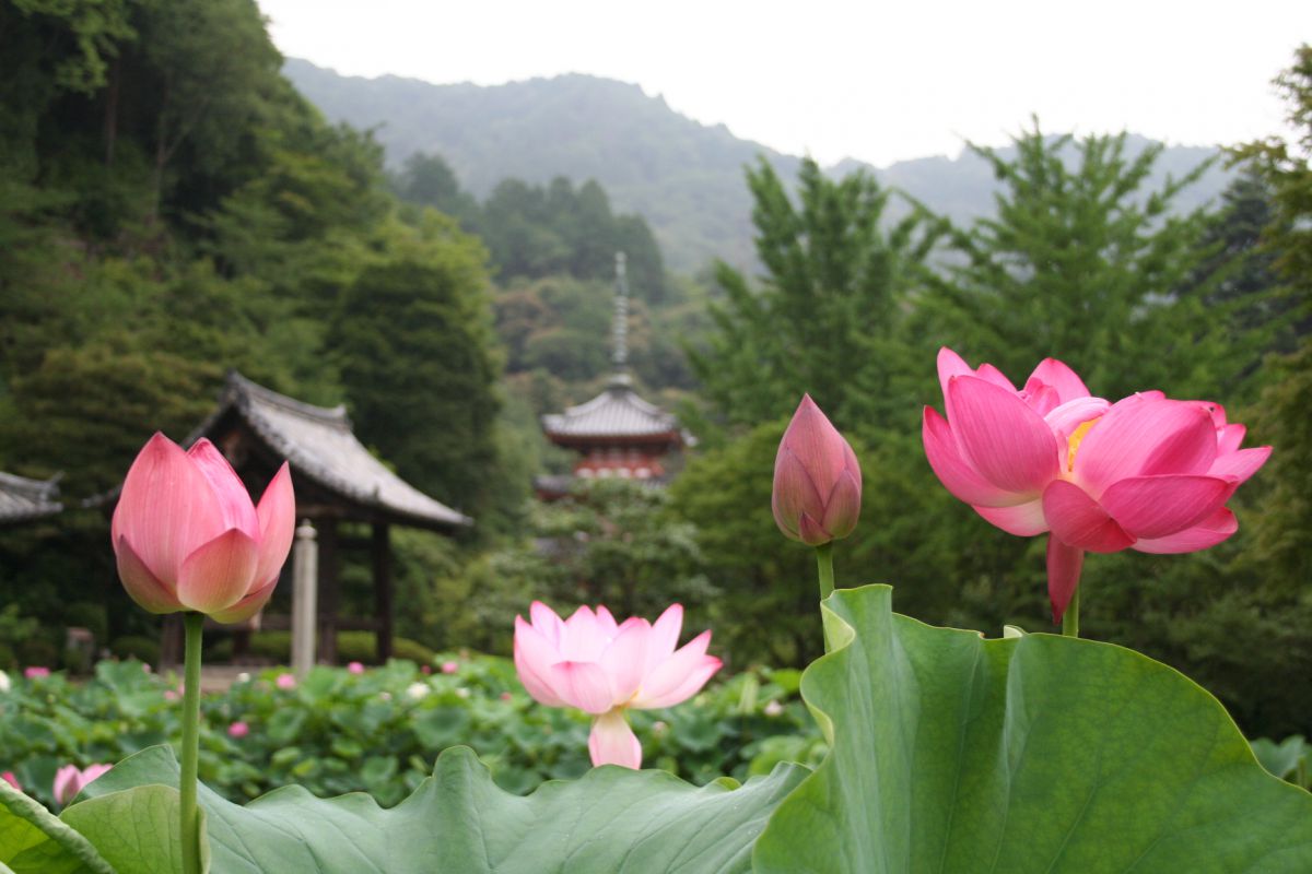 7月上旬から8月中旬に境内を彩るのはハスの花。約100種250鉢の優美な花々が訪れる人々を魅了します。