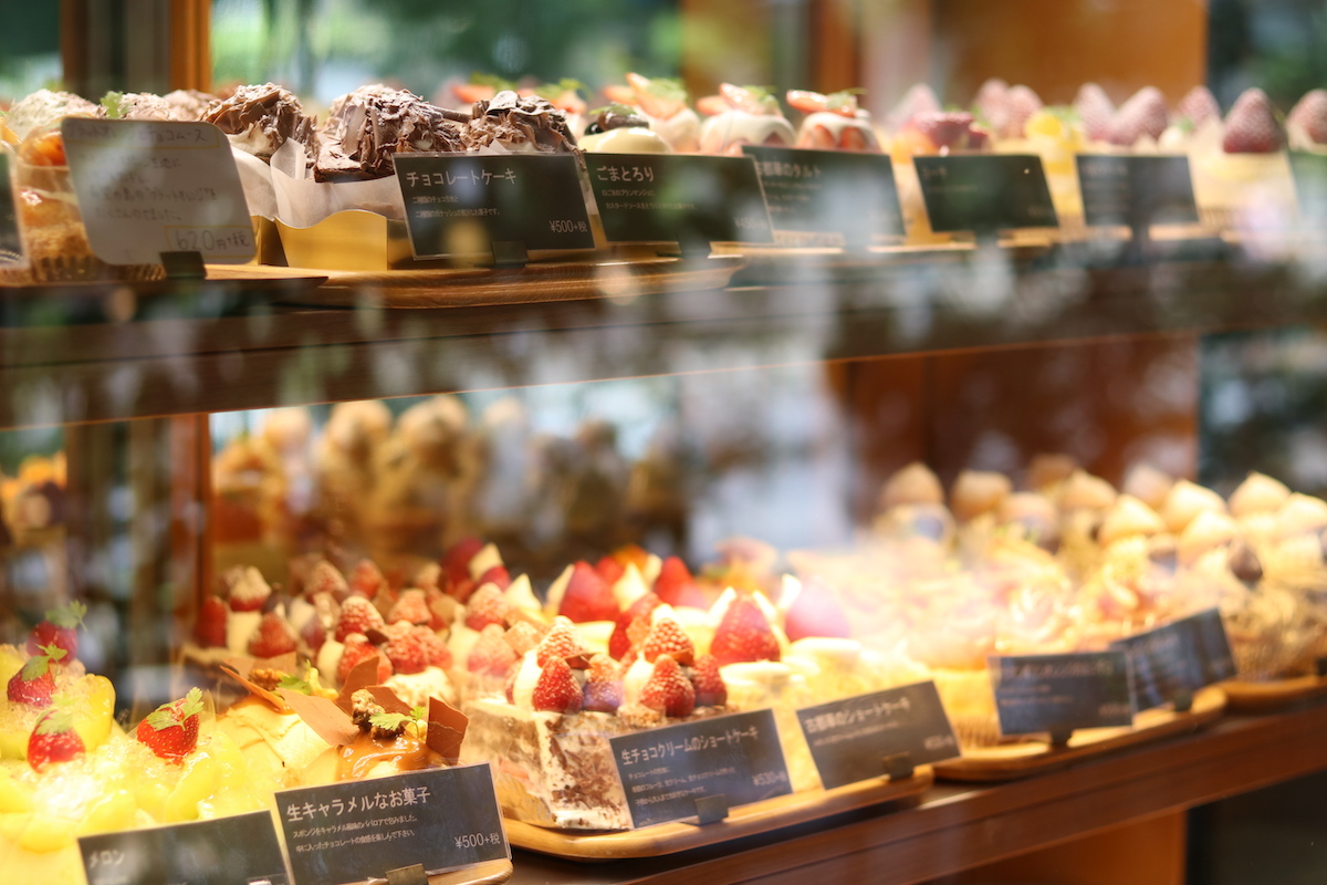 大きな木製ショーケースにはフルーツたっぷりのケーキが並んでいます。定番の「ショートケーキ(540円)」をはじめ、「季節のフルーツタルト(540円)」や「生キャラメルなお菓子(540円)」など、どれも魅力的!